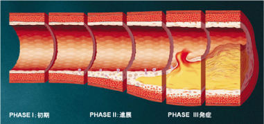 血管内膜の下に脂質が蓄積し、プラークを形成しやがて狭窄を作ります。プラークにカルシウムが沈着してくると血管が硬くなり動脈硬化となります。プラークが破綻すると血栓ができて動脈が詰まります。